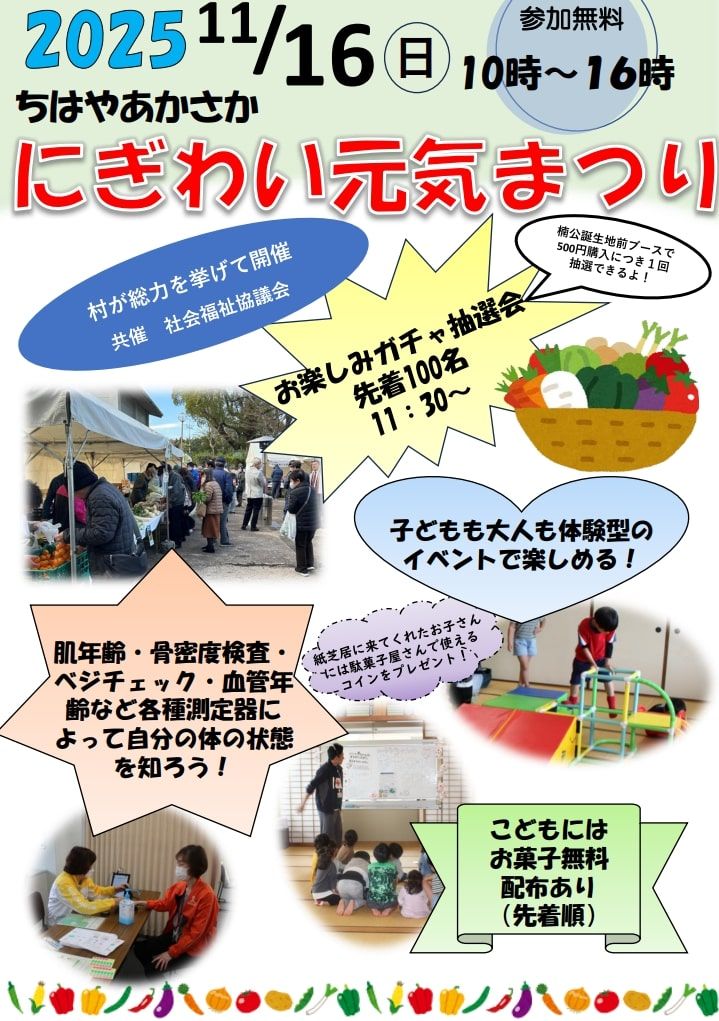 千早赤阪村健康課、農林環境課そして社会福祉協議会が共催となり、10:00〜16:00まで開催します。子どもも大人も楽しめる体験型のイベントで、子どもには先着順でお菓子無料配布、大人には肌年齢・骨密度調査・ベジチェック・血管年齢など各種測定機によって自分の体の状態が確認できます。さらに、先着100名限定でお楽しみガチャ抽選会に11:30から参加(くすのき誕生地目ブースで500円購入につき1回)できます。