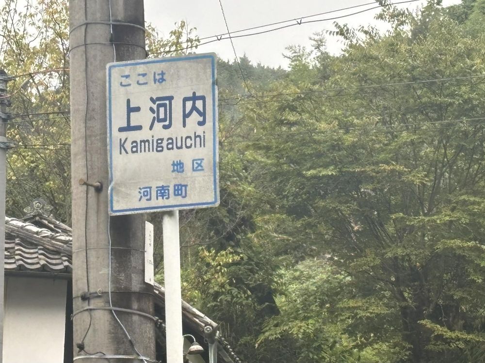 河南町にある河内(下河内、上河内)は、この地域ではよくある準難解地名かもしれません、まず河内なら「かわち」と読んでしまいそうですが、そうではありません。バスの車内のアナウンスで「こうち」と聞こえたので、そう読むと思い込んでいたら、実際は「かうち」と呼ぶと地域の人に教えていただきました。さて画像の「上河内」は「kmigauchi(かみがうち)」と表記されています。