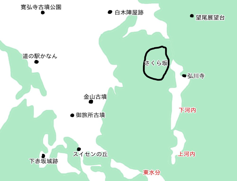 河南町は、これからの季節に歩くのに最適だと思います。図の中で緑色が山で、白いのが平野や盆地なのですが、ちょうどさくら坂から見て東南の位置にある弘川寺、下河内、上河内と小さな盆地のようになっていて、千早赤阪村の東水分まで一本の道(大阪府道200号上河内富田林線)が続いています。