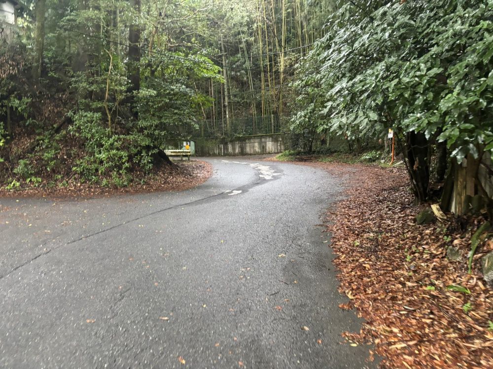 道が合流したところで、振り返りました。右側の道から来ました。ちなみに左側の道を地図で見るとグロワールゴルフ俱楽部に行けます。そして途中から道が分かれていて、ゴルフ場の横を北側に、金剛霊園やさくら坂まで道が続いていました。