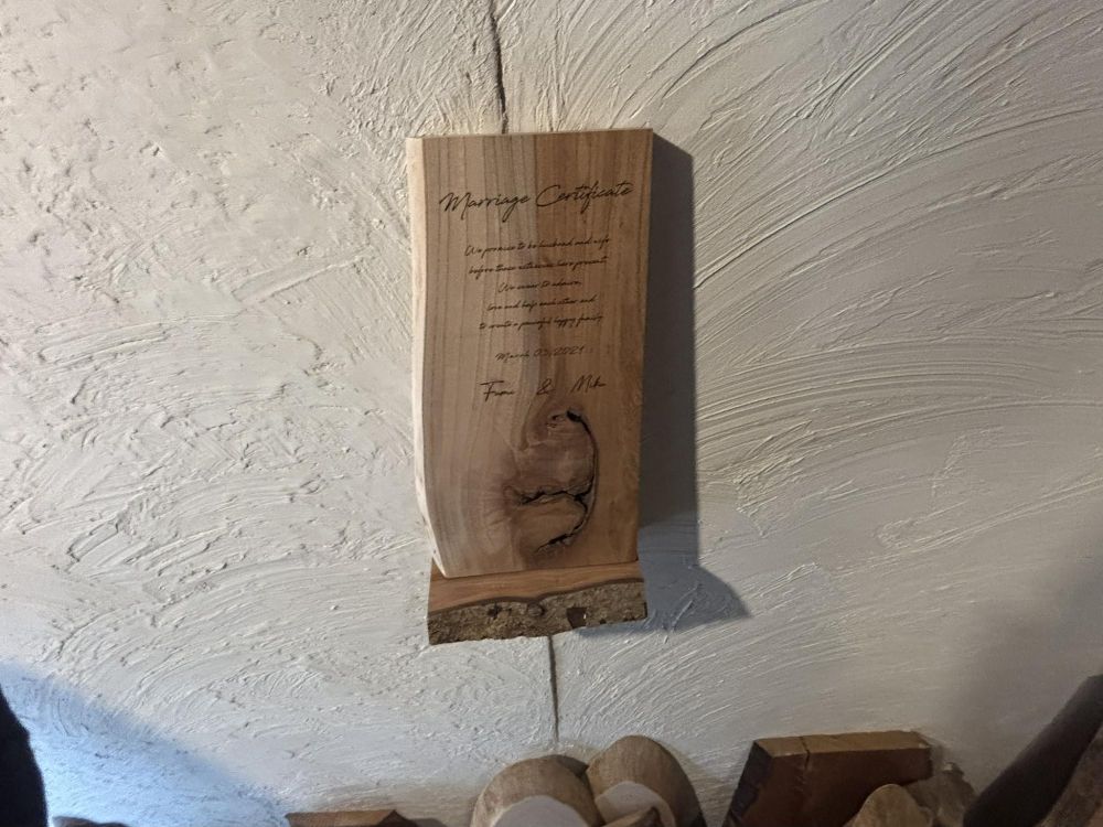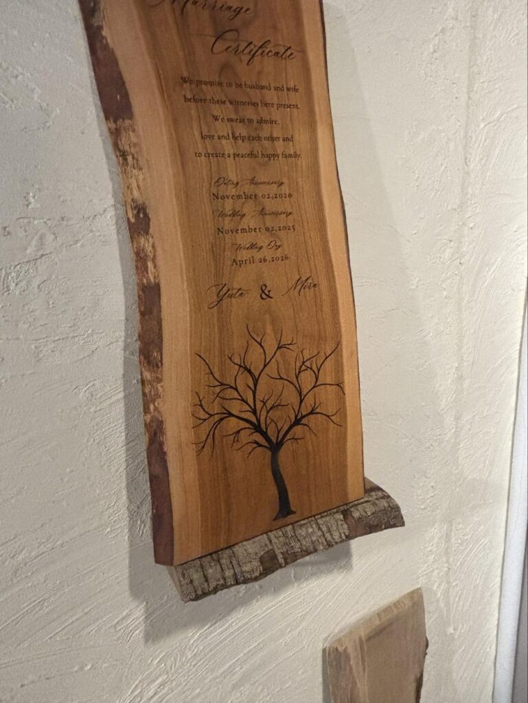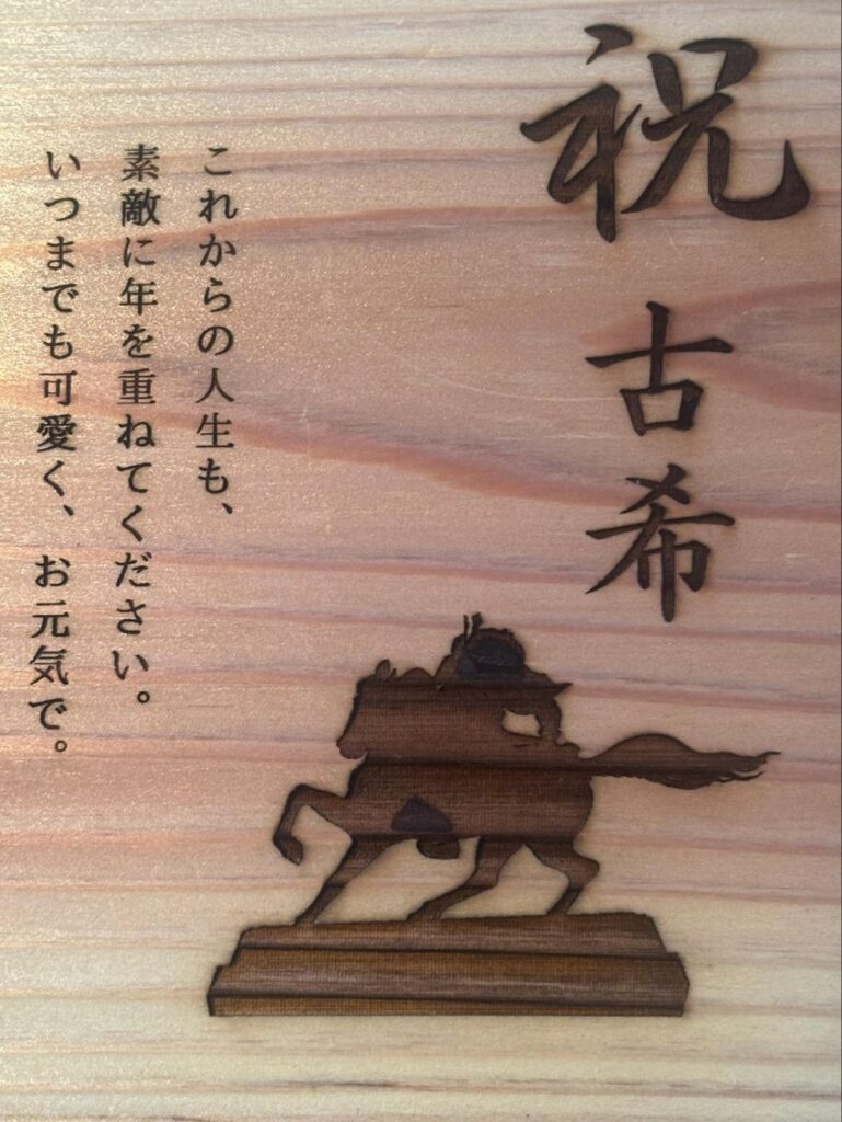 そして結婚記念の他にも、人生の記念をレーザー彫刻で表現できます。画像は古希(70歳)を記念したものです。また、出生記念にもレーザー彫刻で表現できます。納品前の作品なので画像はないのですが、生まれた赤ちゃんの足形と身長、体重、生年月日、誕生した時間などを木に刻むことができます。いずれにしても一生ものですね。