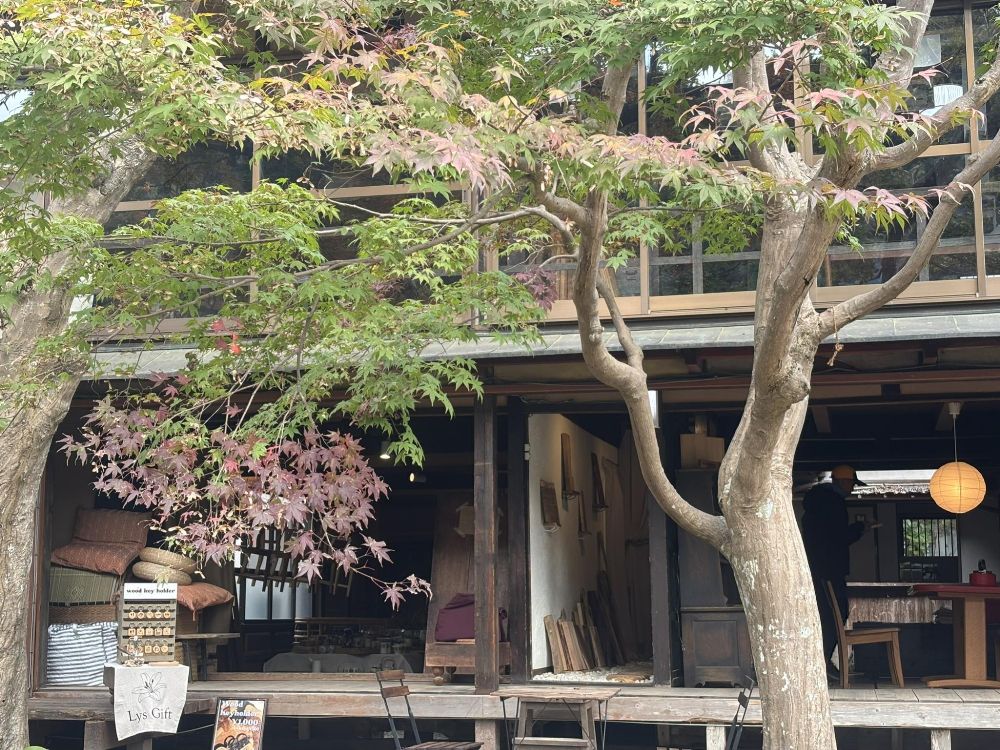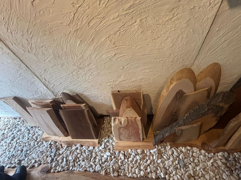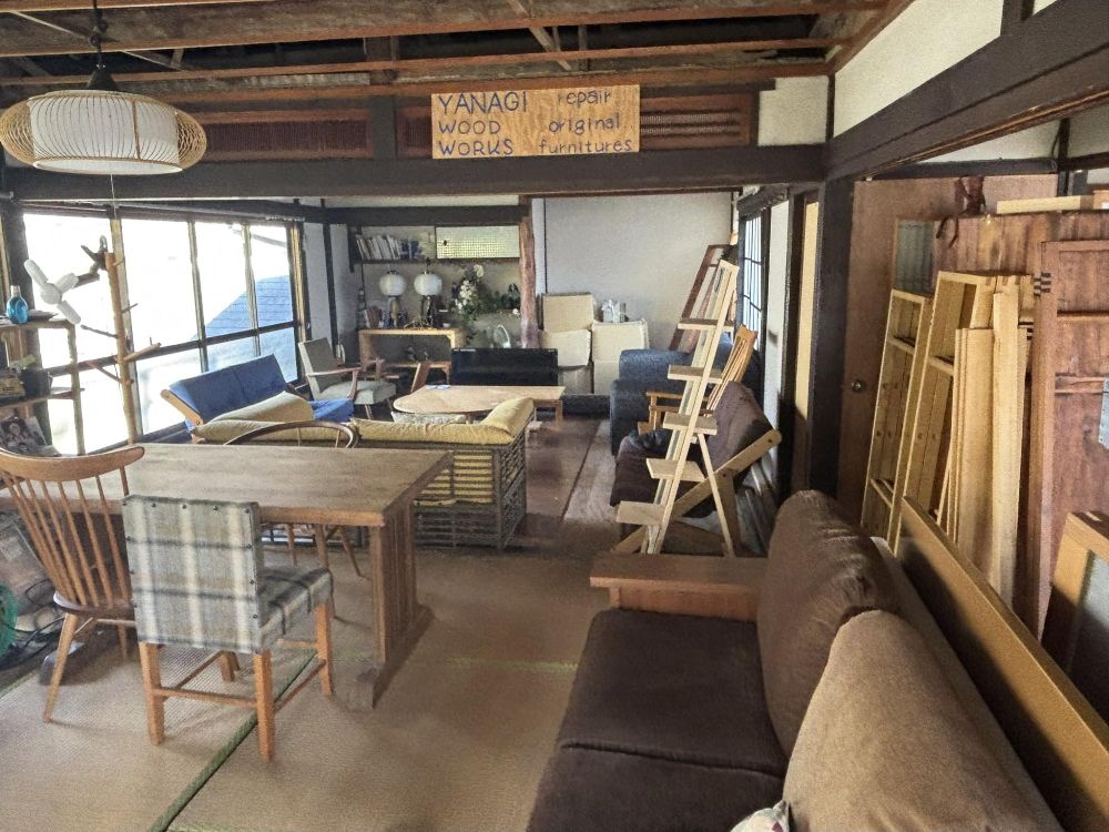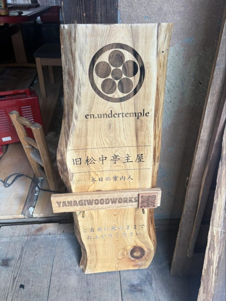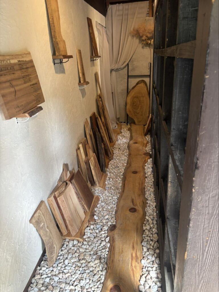 甲冑隊の仕事を終えてからenさんのカフェ「離れ茶屋恕意」で、林さんも含めて休憩したのですが、それが縁となり、主屋の一室を借りることになったとのこと。また大きな木を切断するのに、木の家具を手掛けているヤナギウッドワークスさんがいることも決め手となりました。ただしヤナギさんはカットだけで、その後のヤスリ掛けは林さんが行うそうです。