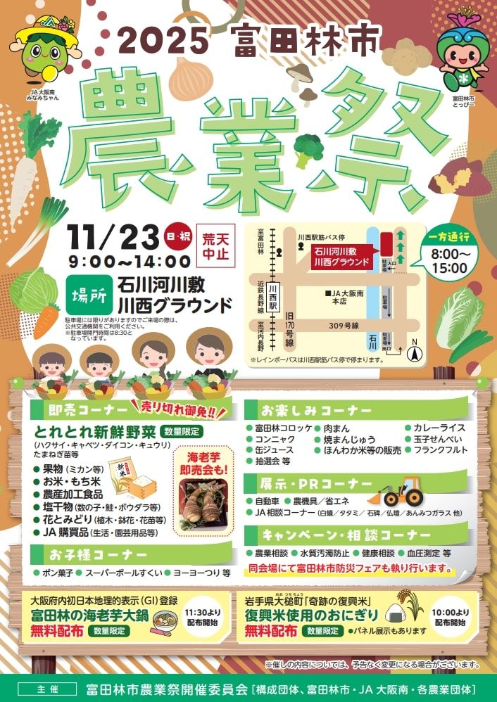 大阪府内でも富田林は名物海老芋をはじめナスやキュウリの出荷量が多いですが、今年も2025富田林市農業祭を勤労感謝の日(11月23日)に開催します。もともと新嘗祭だったこの日に富田林市農業祭開催委員会が実施します。会場は春になるとこいのぼりが大空を舞う石川河川敷川西グランドで、荒天時は中止です。