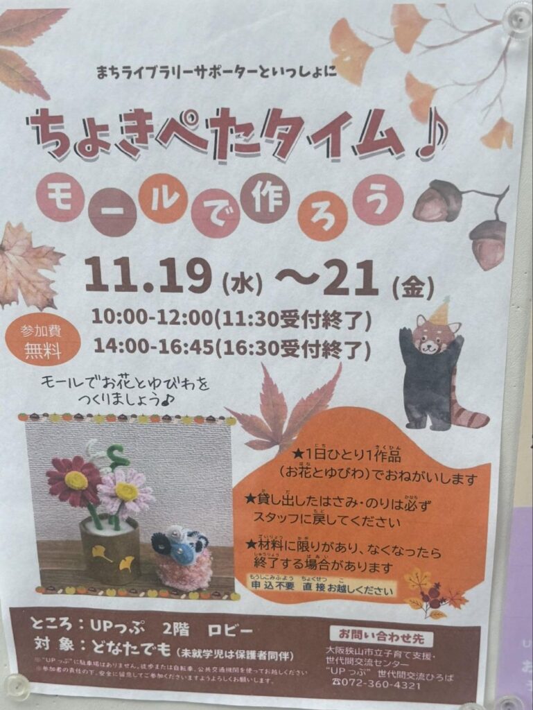 【大阪狭山市】大阪狭山市駅近くのUPっぷで、ちょきぺたタイムモールで作ろうを11月19日から21日まで3日間開催(オリジナル)
