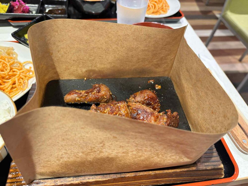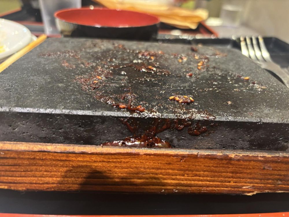 ということでステーキをいただきましたが、鉄板が思ったよりも分厚いです。そのためでしょうか?紙の壁との相乗効果で11月でも最後まで温かく肉がいただけたのですね。