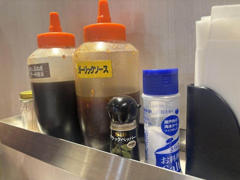 ちなみにステーキを味わうためにこちらの調味料が選べます。つまようじの隣にあるのが「おろし玉ねぎステーキ醤油」で、その隣が「ガーリックソース」ですが、意外にもソースよりも醤油のほうが濃厚でした。さらにご飯にかけて食べても美味しかったです。