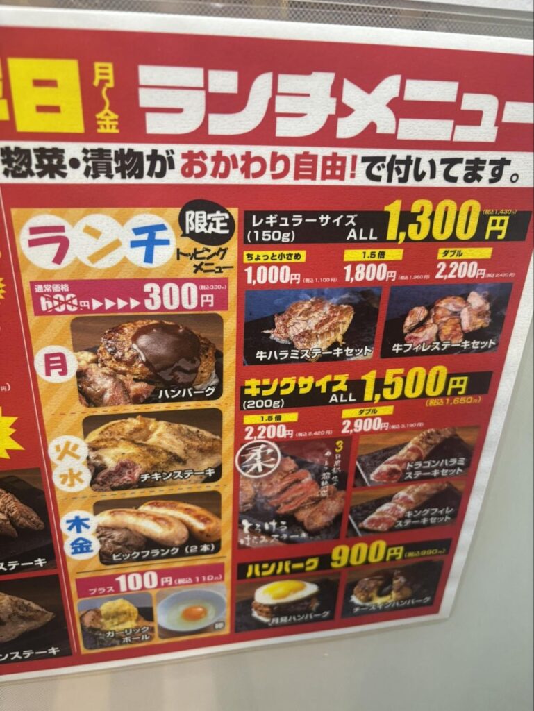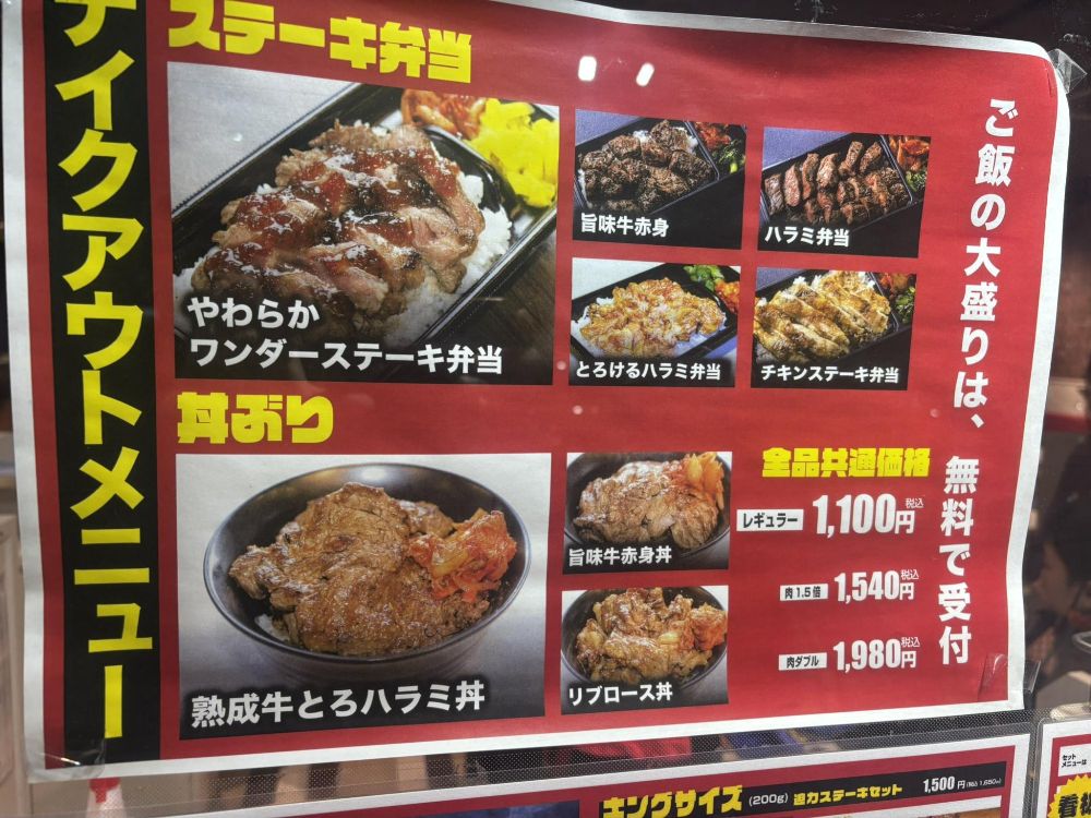 テイクアウトもあるようで、弁当で1000円台はステーキだから仕方がありませんが、がっつりの肉の入った弁当を食べたいときにも嬉しいし、さらにご飯の大盛が無料というのは、昨年から高騰した米価格のことを考えてもお得感があります。