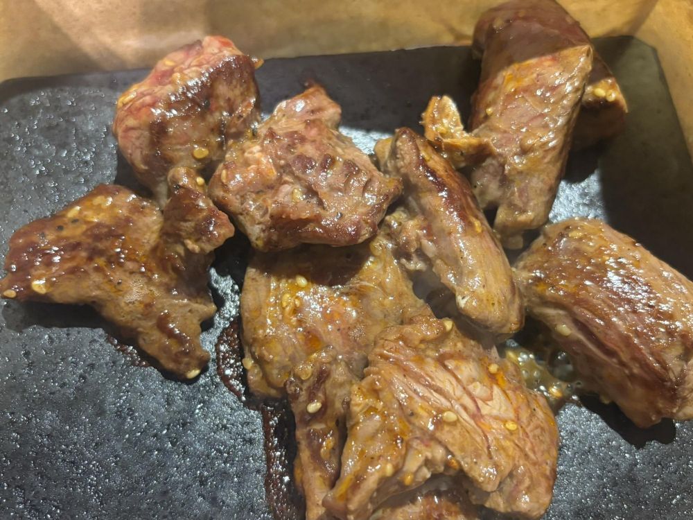3日間秘伝のタレに漬けて熟成することでできたという「とろけるハラミステーキ」です。一口サイズにカットしてくれているのも、やわらかい肉を求めている層にとってはありがたいですね。
