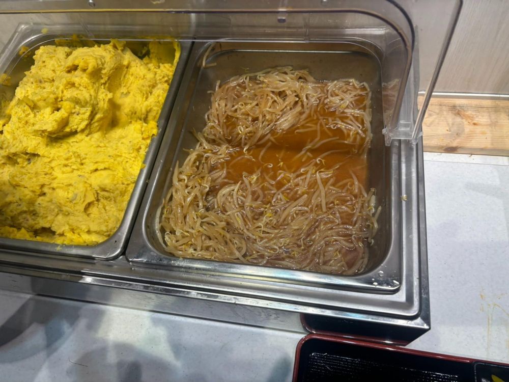 総菜には、もやしをナムル風に和えたものやカボチャサラダにカレー味をつけたものもありました。それにしてももやしは人気がありますね。