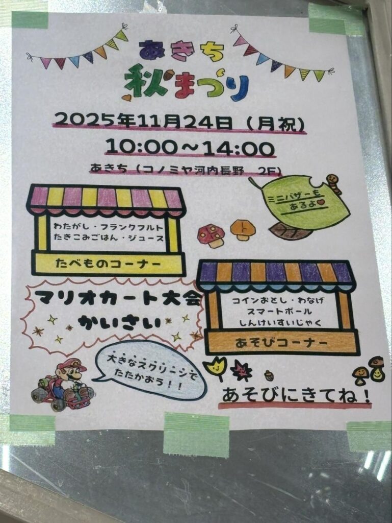 松が丘中町にあるコノミヤ河内長野店2階「あきち」で11月24日の10:00〜14:00までの予定で秋祭りを実施します。