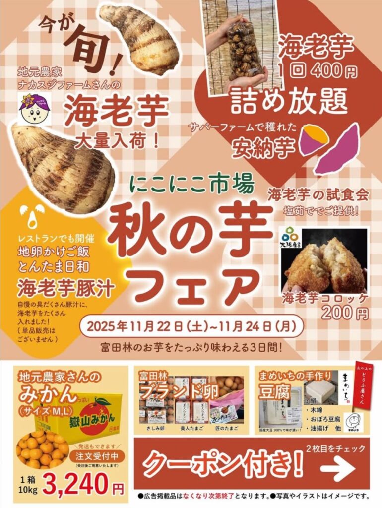 富田林市農業公園サバーファームに併設しているにこにこ市場で、22日から24日まで秋の芋フェアを実施します。