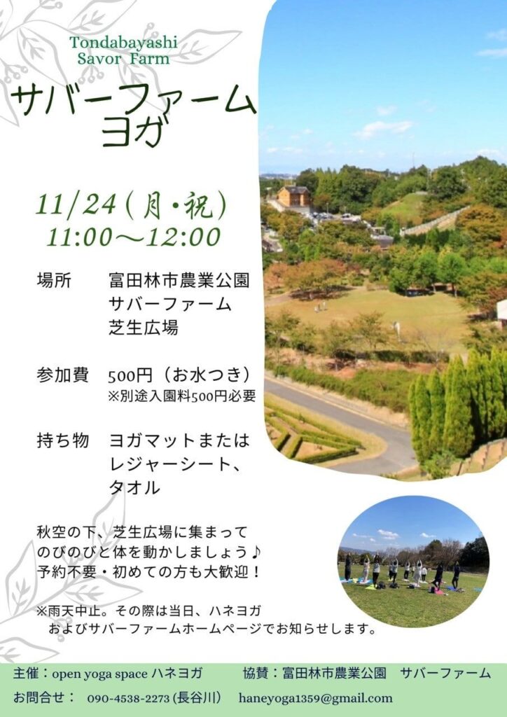そして芋フェアの最終日24日はサバーファームの芝生広場で「サバーファームヨガ」を実施します。秋空の下、芝生広場でのびのびと体を動かしてみましょう。事前予約不要で初めての人大歓迎。参加費はお水付きで500円(別途入園料は必要)です。ヨガマット又はレジャーシート、タオル持参のうえ参加できます。