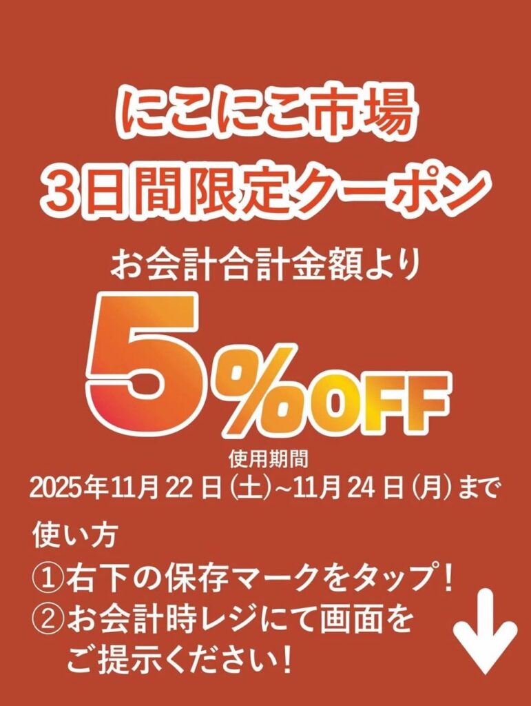 そして3日間限定クーポンが用意されています。会計時にスマホからクーポンを提示すると合計金額から5%OFFとなります。3日間限定なので来店のまたとない機会です。そのほかにも地元農家さんのみかん注文受付、富田林ブランド卵、まめいちの手作り豆腐の販売もあります。ただし無くなり次第終了です。