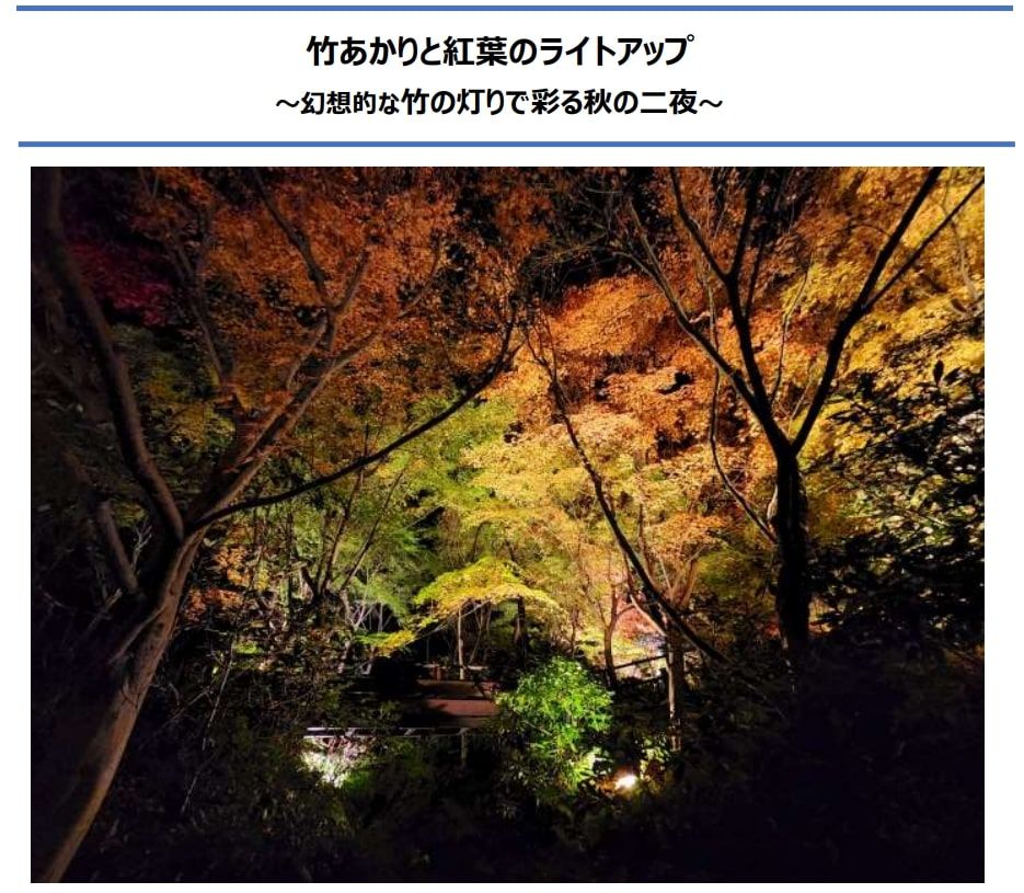 そして、今年も「竹あかりと紅葉のライトアップ」の開催が決まりました。11月29日から30日の2日間、夜間特別開園が行われます。時間は17:30~20:00までで、昼間の営業を17:00に終わってからいったん閉園して再開園となります。料金は高校生以上が300円ですが、当日の昼間入園したい人はレシートを持っているとそのまま入れるとのこと。