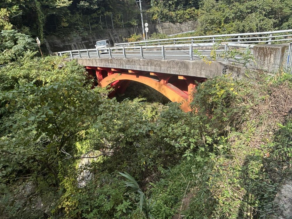 汐滝橋バス停から汐滝橋が見えます。車やバスで通過すると見えない風景、実はアーチ橋になっています。