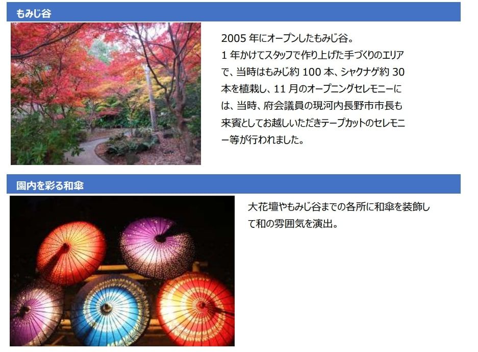 花の文化園によるともみじ谷は2005年にオープンし、イロハモミジ、ヤマモミジ、ノムラモミジ、イタヤカエデなどが植えられていて園全体で約 20 品種、約 120 本植栽。ライトの数は約 40 灯。手づくりの竹あかり(竹灯篭)は約 200 灯で幻想的な世界をくりひろげます。