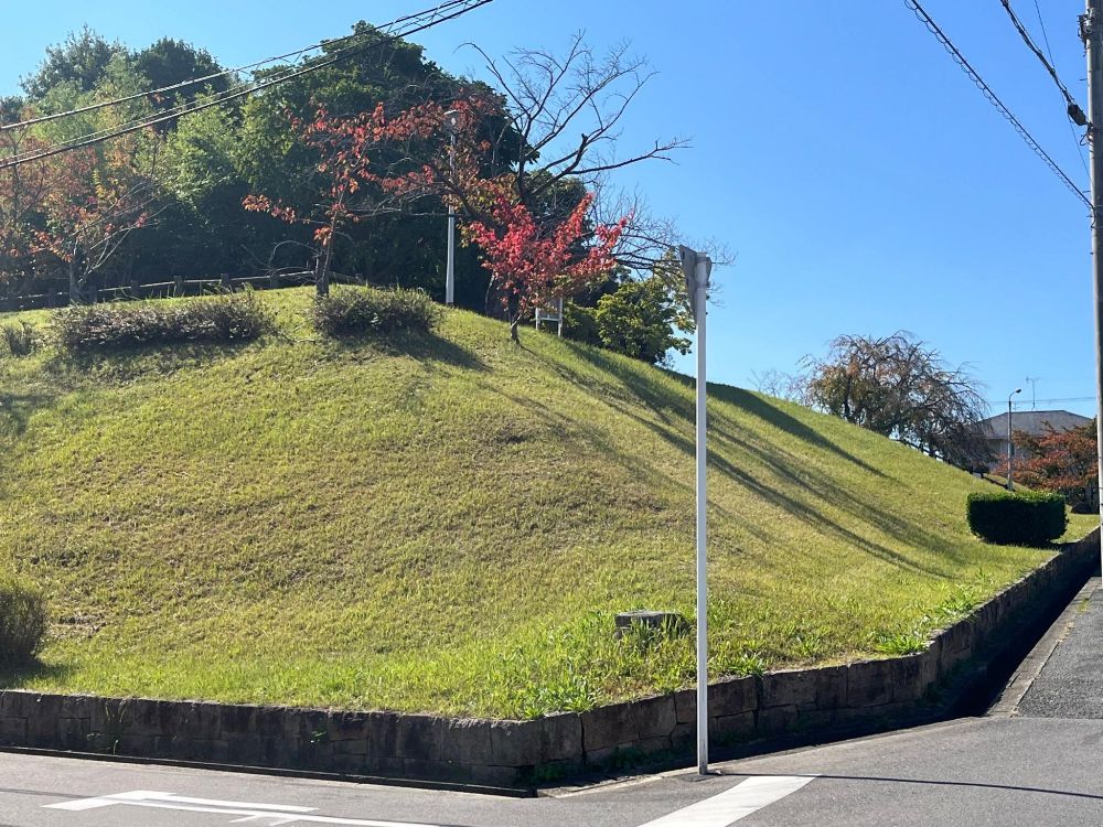 津々山台2号公園の前に来ました。元々古墳だったところが公園になっているだけあって、小さな丘のように盛り上がっています。また芝生になっていてピクニックにも最適ですね。