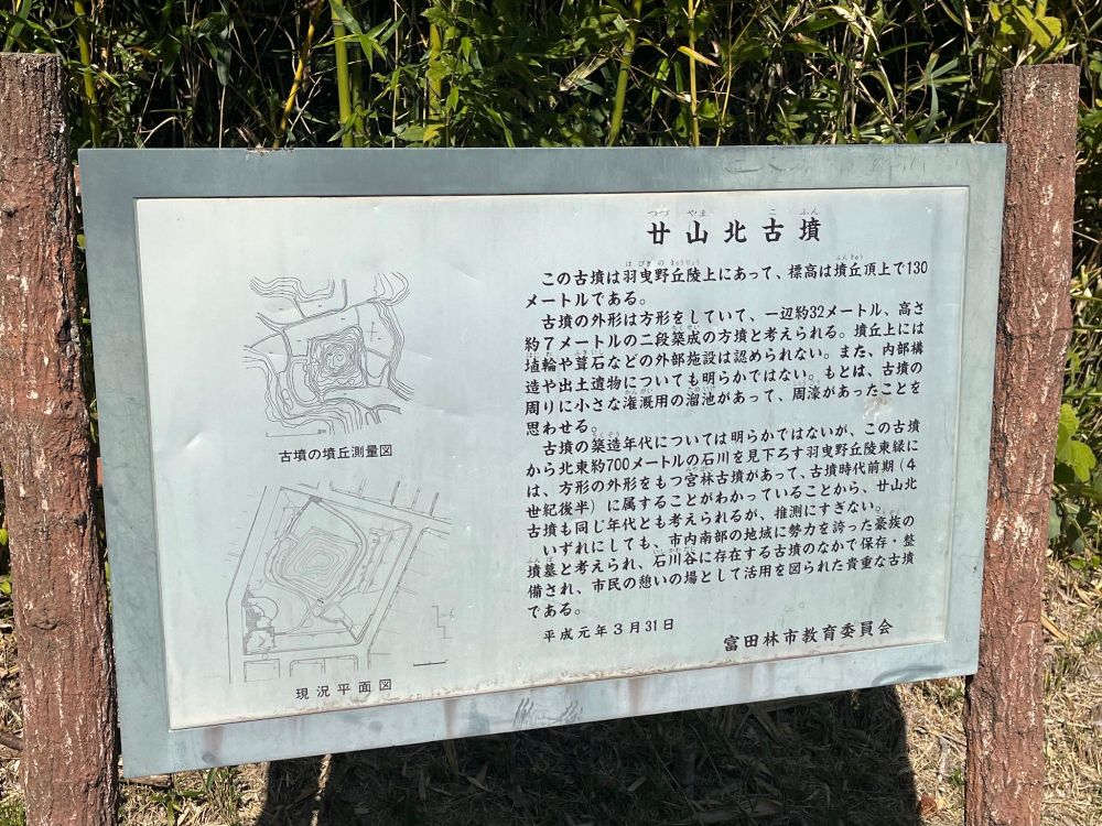 こちらが廿山北古墳の説明版です。説明によると、ここから700メートル北東にある宮林古墳の状況から古墳時代前期(4世紀後半)のに作られた可能性(推測の域を出ていない)がある古墳です。