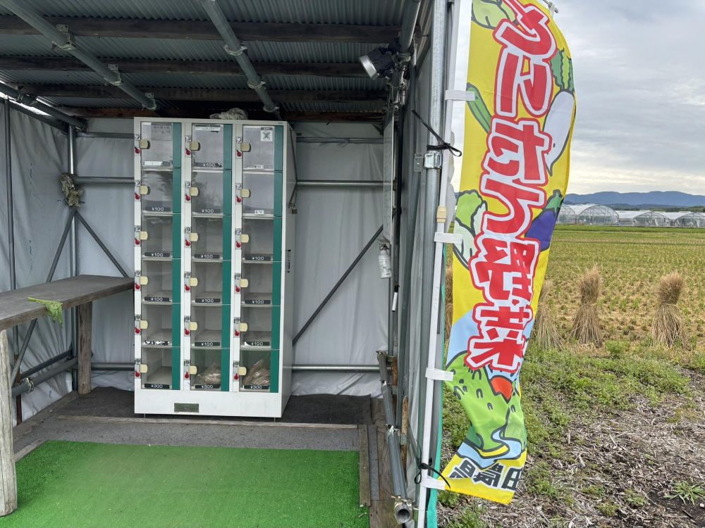 境界線付近には無人販売所があり、お金を入れるとロッカーの中の農産物が手に入るようになっていました。