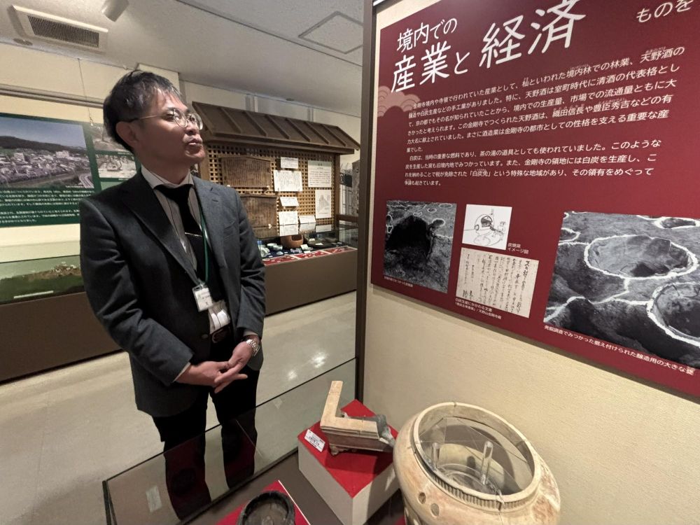 こちらの甕は天野山金剛寺でかつて僧房酒「天野酒」と作る際に使っていたとされるものです。今の天野酒は西條酒造さんが醸造していますが、天野酒をお土産に買う前に展示物を見ると当時のイメージを膨らませられますね