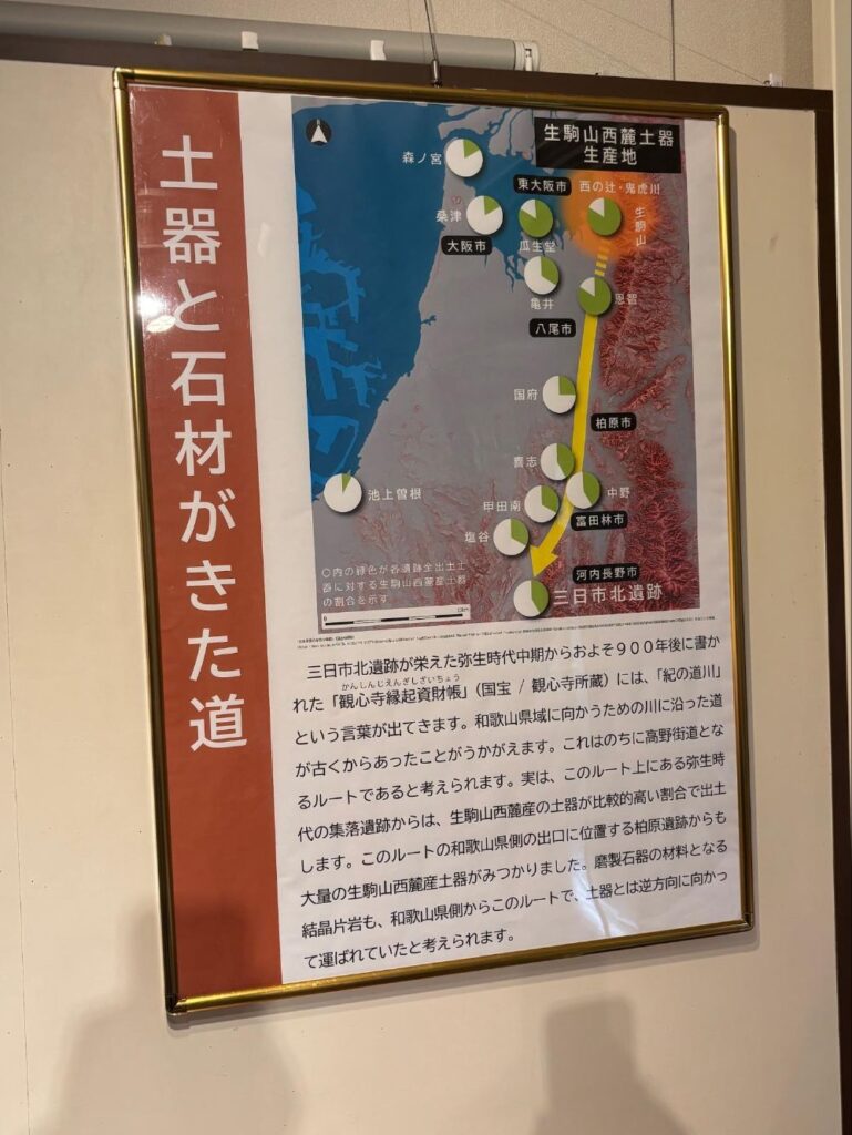 弥生時代には東大阪市の近くまで河内湖があり、その近くで造られた土器が、紀の道川(東高野街道)を通って河内長野三日市北遺跡まで来た様子が紹介されています。当時から使われていた道なんですね。