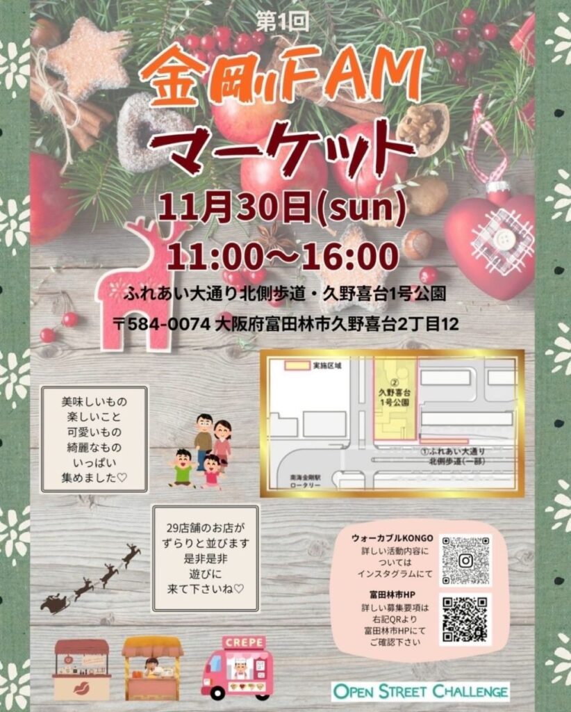金剛きらめきイルミネーションがスタートしたふれあい大通りの北側歩道と久野喜台1号公園(シロクマ公園)を利用して第1回目となる金剛FAMマーケットが11月30日に開催されます。地域(富田林市、大阪狭山市)を中心に人気のお店が30店ほど集まって行われます。