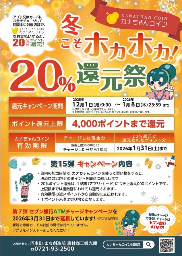 今年もあと1ヶ月となりました。年末年始は何かとお金が必要な時期ですが、河南町ではそんなお金が必要な時に懐が温まるようなカナちゃんコイン20%還元祭を12月1日から実施します。