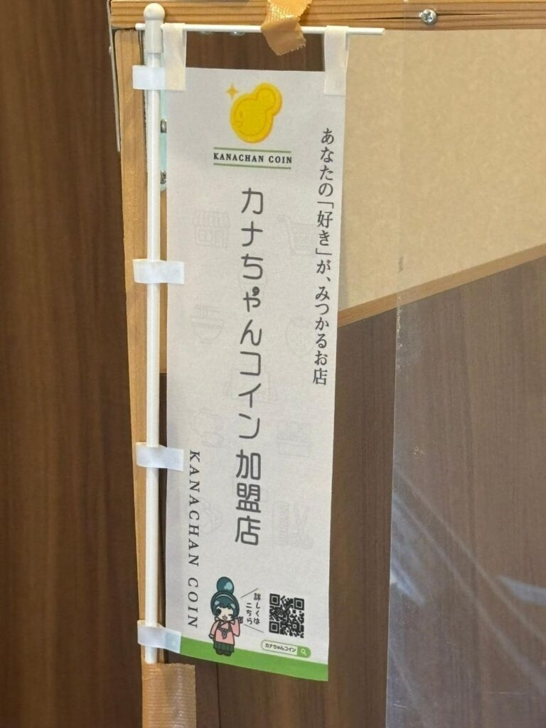 - 1.町内の加盟店舗(外部リンク)でカナちゃんコインを使って買い物をすると、決済額の20%分のポイントを即時に還元