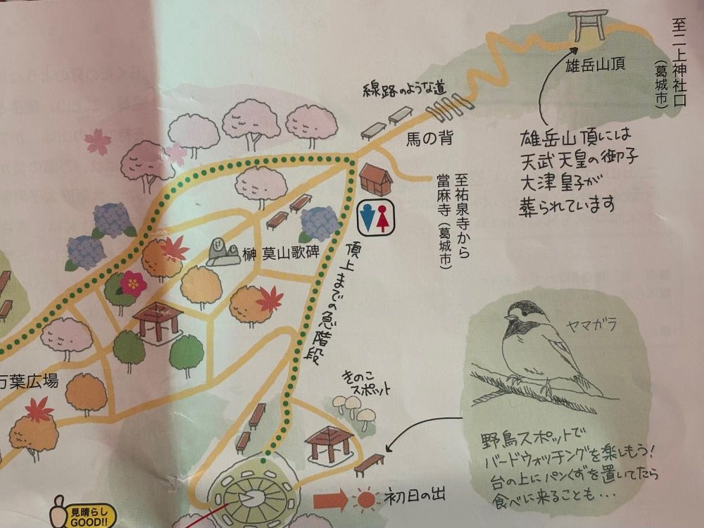 太子町観光協会でいただいた「二上山万葉の森山歩きMAP」の一部を見ると、雌岳のほうは詳しいのですが、なぜか雄岳の方はほんのわずかしか載っていません。