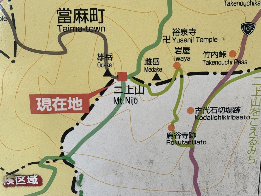 考えられる理由として、二上山の馬の背に掲示してあった地図で、ちょうど奈良県当麻町(掲示当時:現葛城市)との境目で、雄岳は奈良県寄りにあるからかもしれません。