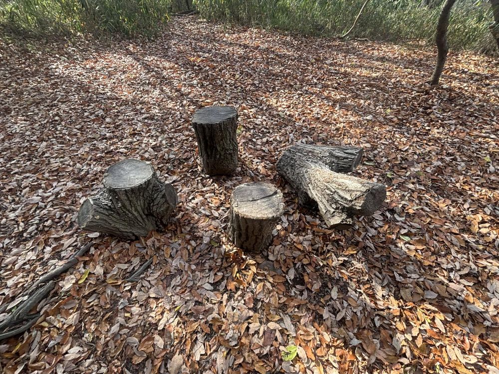 広場の真ん中に切り株があり、ここに座って休憩はできます。
