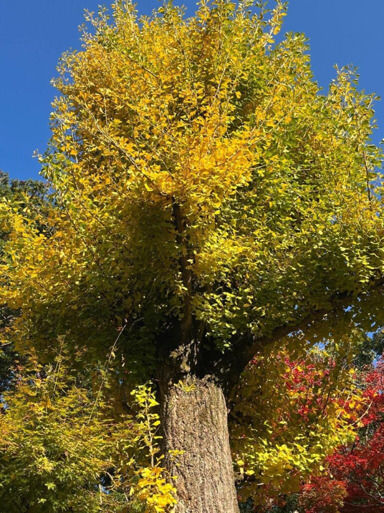 そして楠妣庵は紅葉だけでなく銀杏も色づいていました。赤と黄のコラボで、雲のない青空であれば色の三原色が一枚の写真で表現できます。平日は本当に人がいなかったので、貸し切りでじっくりと堪能できました。