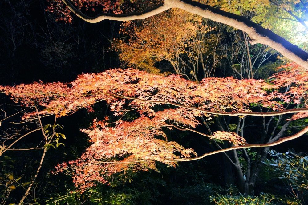 大阪府立の植物園で、最近では通称2億円トイレが移築されることが決まったことで話題となった花の文化園では、11月末に毎年夜間営業をしていて紅葉の夜景が見られます。残念ながら2025年は終わってしまったのですが、昼間であればまだ紅葉が堪能できます。他のスポットと違い、冬の花が見られるのが他のスポットと大きな違いです。