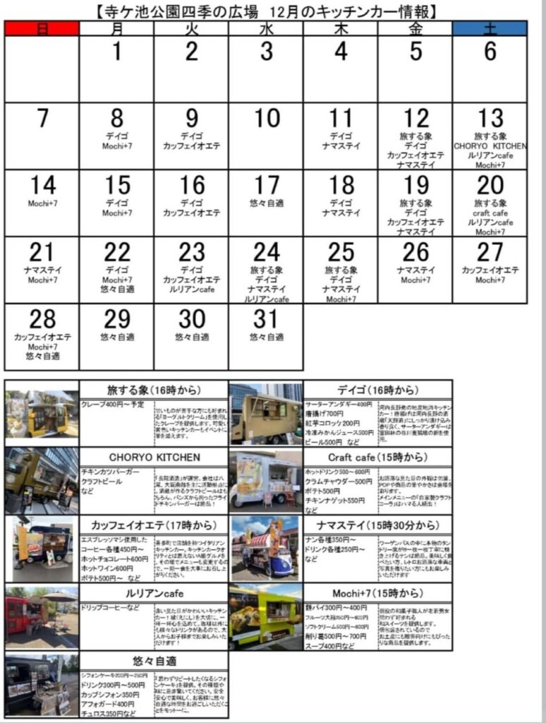 和みマルシェが終わった8日以降も寺ヶ池公園イルミ店頭期間中は、連日様々なキッチンカーが登場しますので、美しいイルミを見ながらキッチンカーで食べ物や飲み物が買えます。12月のスケジュールは上記の通りで10日以外は毎日何らかのキッチンカーが出ます。