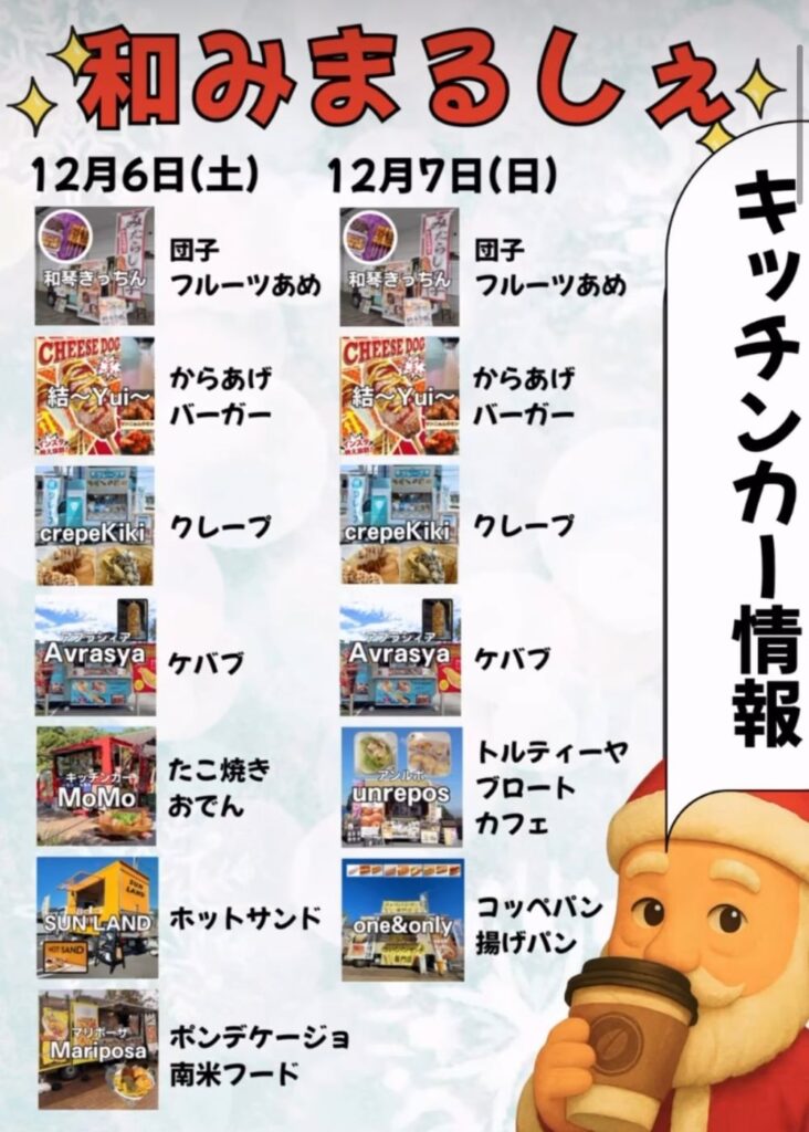 画像は和みまるしぇで登場するキッチンカー情報です。和琴キッチンさんによると、今回は和みまるしぇ最大級のマルシェととなっており、飲食ブースをはじめ雑貨や多肉植物販売、さらにワークショップ&ハンドメイド、子供に人気のフワフワ遊具と縁日など本当に多種多様の出店が行われるとのこと。