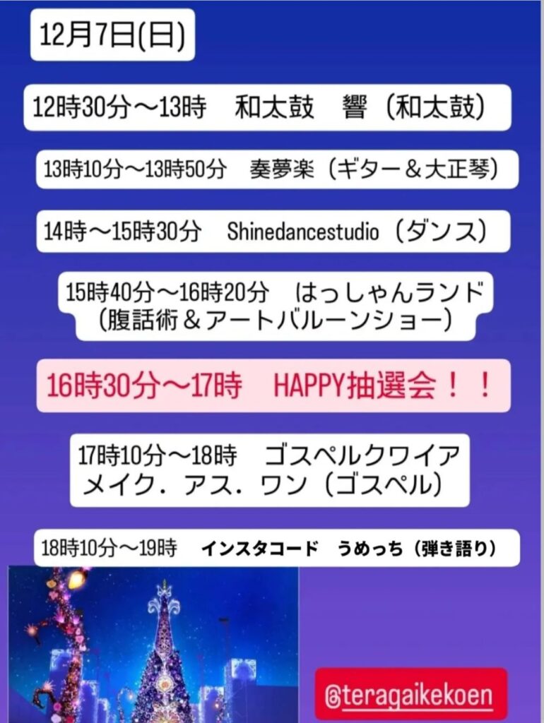 今年もイルミネーションの点灯カウントダウンがおこなわれるとのこと。寺ヶ池公園によれば出店者とスタッフがクリスマスの衣装と装飾で迎えるそうなので、もしよろしければクリスマス衣装での来場を歓迎するそうです。