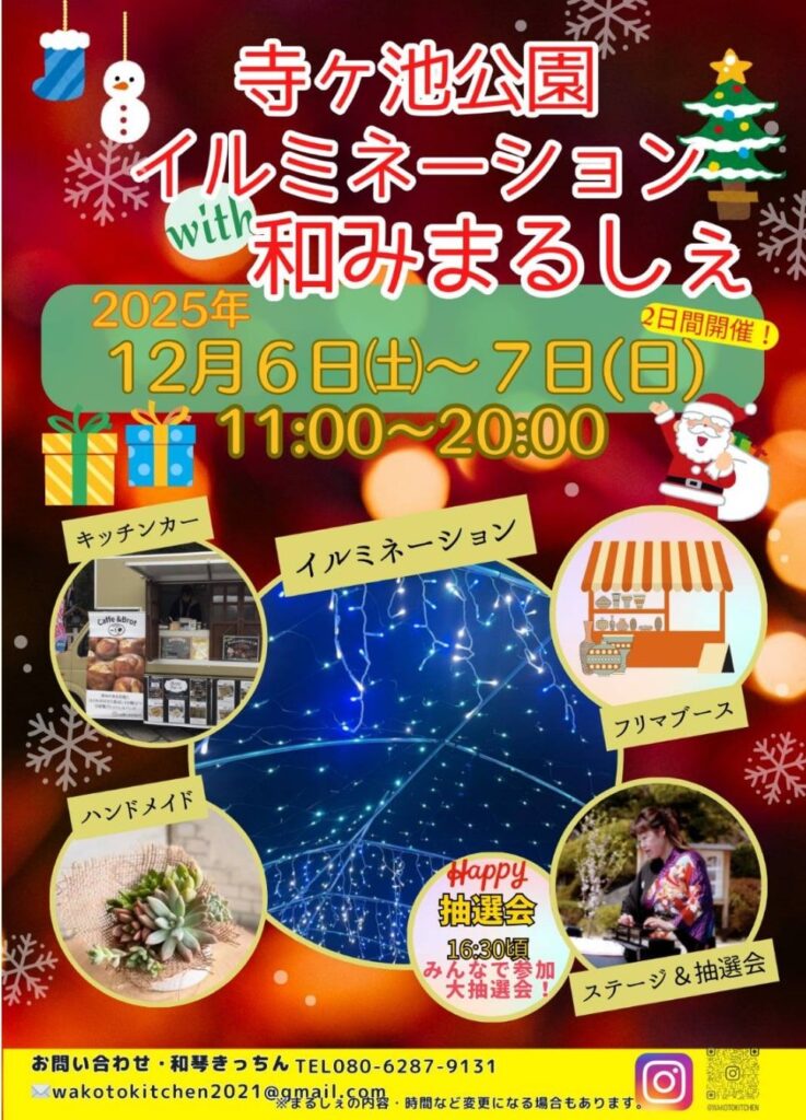 イルミ点灯の初日と2日目(12月6、7日)は、和風キッチンカー「和琴きっちん」(外部リンク)さんが主催する和みマルシェが同時開催されます。11時から20時までの9時間のロングラン開催で、16:30頃にはみんなで参加する大抽選会が行われます。