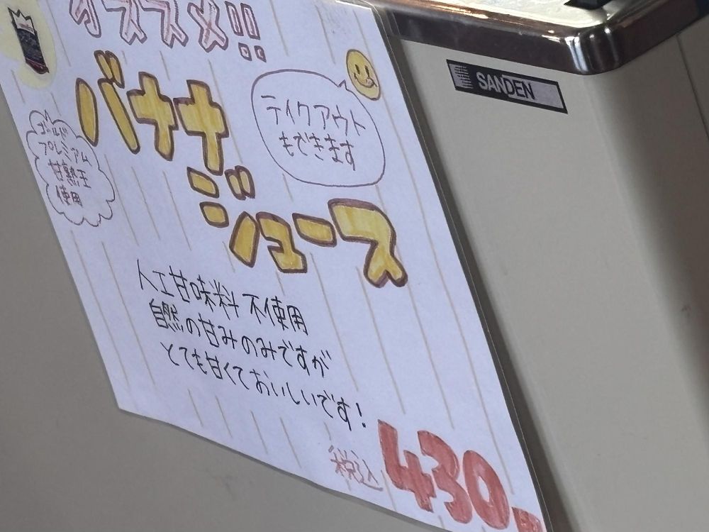 テイクアウト可能なバナナジュースもあります。それにしても手書きのPOPメニューが多いのが特徴ですね。