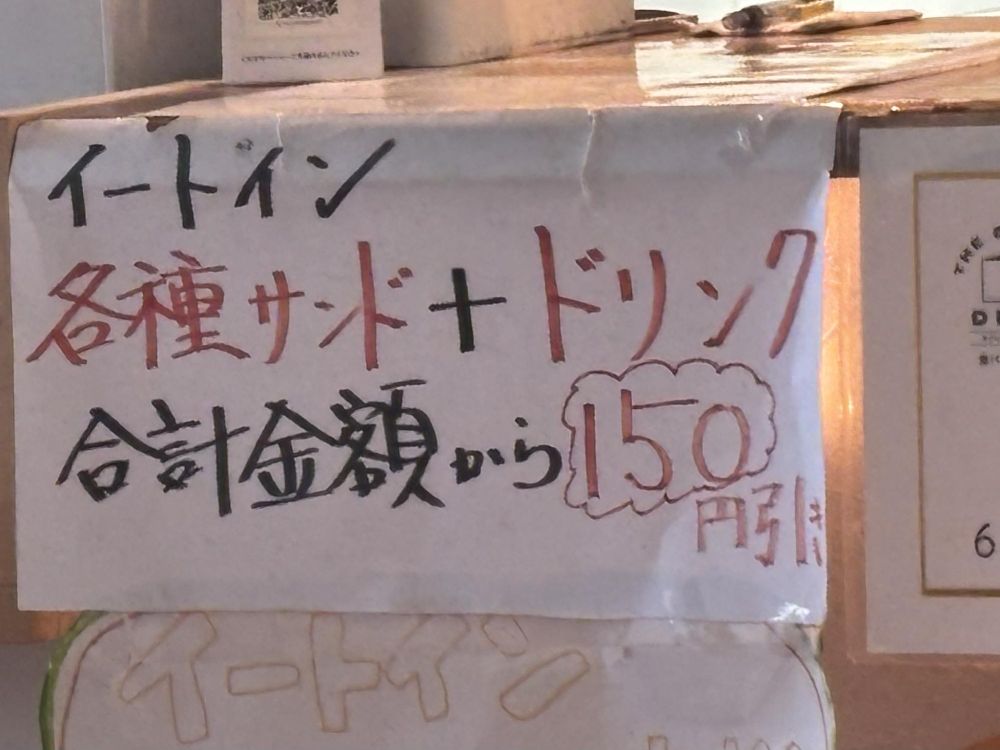 さて、イートインの場合、各種サンドとドリンクを合わせると150円安くなります。
