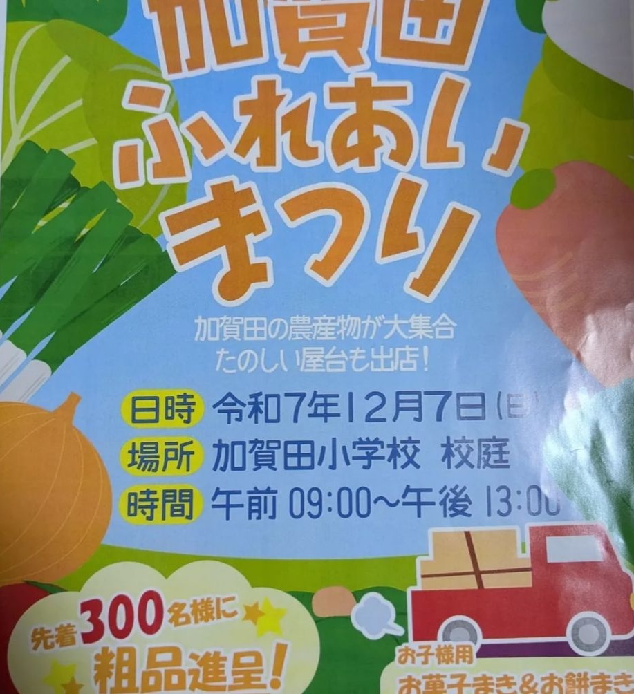 加賀田ふれあいまつりは毎年12月に加賀田小学校の校庭を会場に加賀田の農産物を販売しているイベントです。9:00〜13:00の予定で行われており、先着300名には粗品もあるとのこと。さらにお子様向けにお菓子撒きとお餅撒きが行われます。