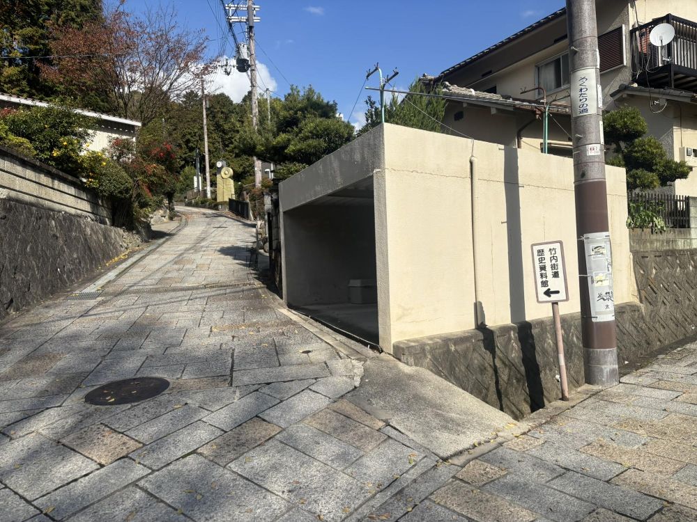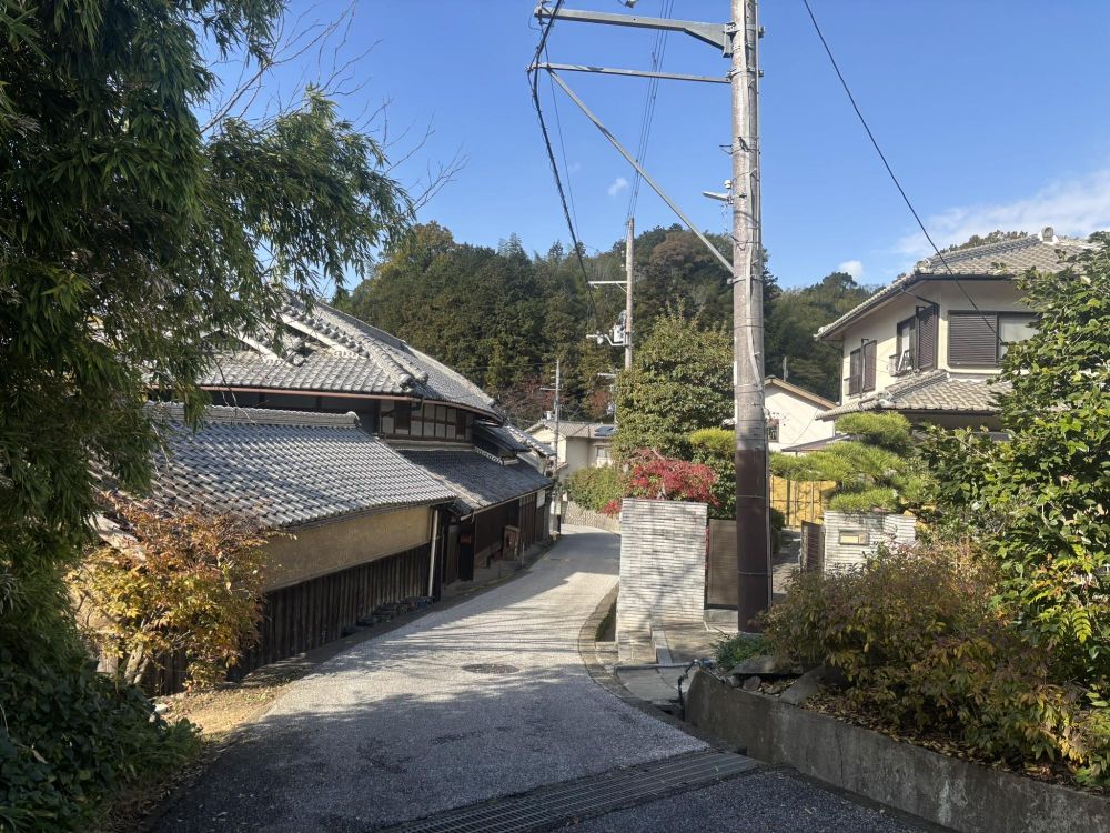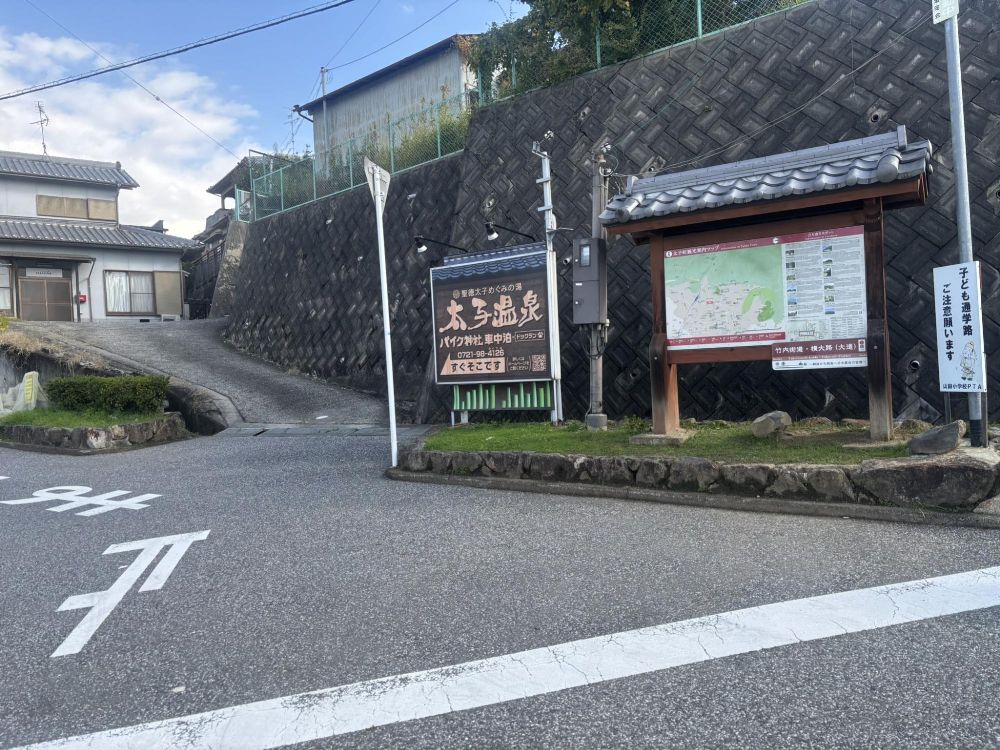 バス停から竹内街道を歩いていくと、太子温泉の看板があります。ここを過ぎると風情ある旧街道の雰囲気が味わえるようになっています。