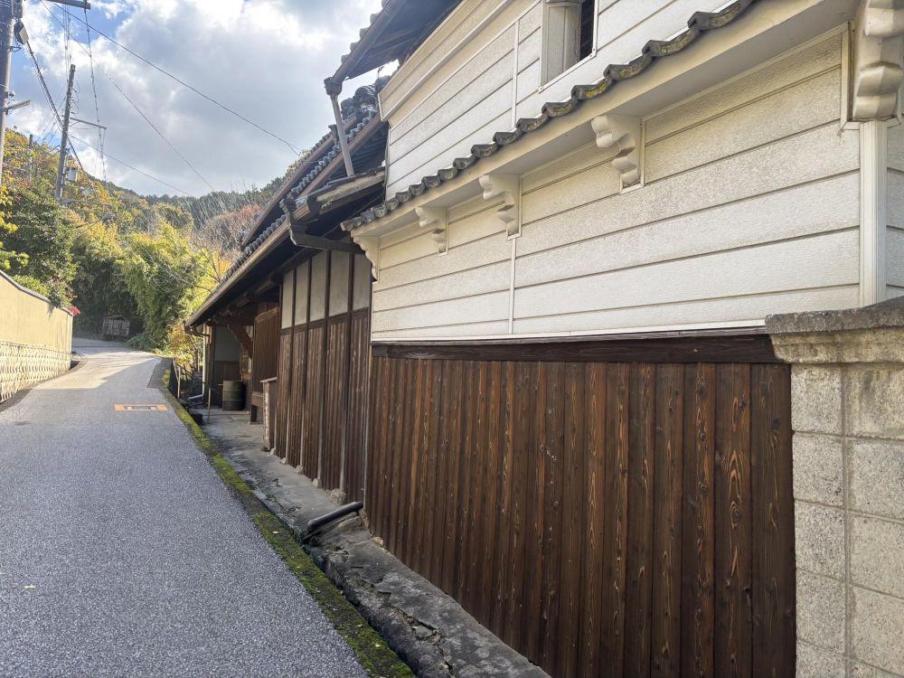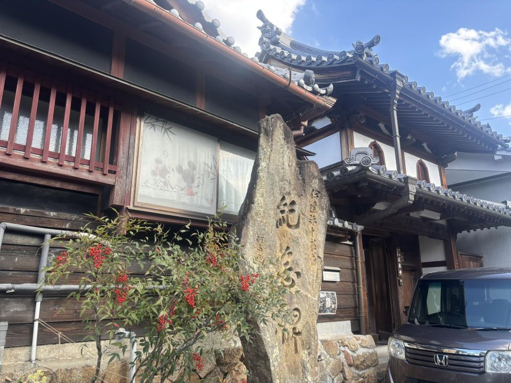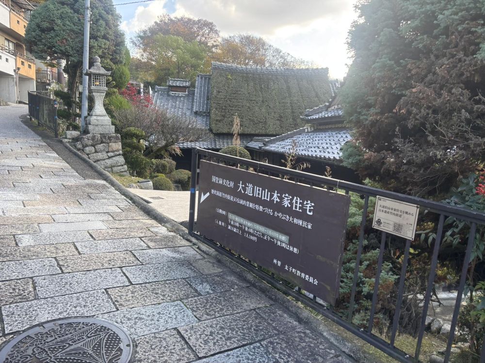 こちらが大道旧山本家住宅です。竹内街道沿いの歴史的景観を特徴づけるということで「国登録有形文化財」に登録されています。また入口左側に伊勢灯篭が見えます。