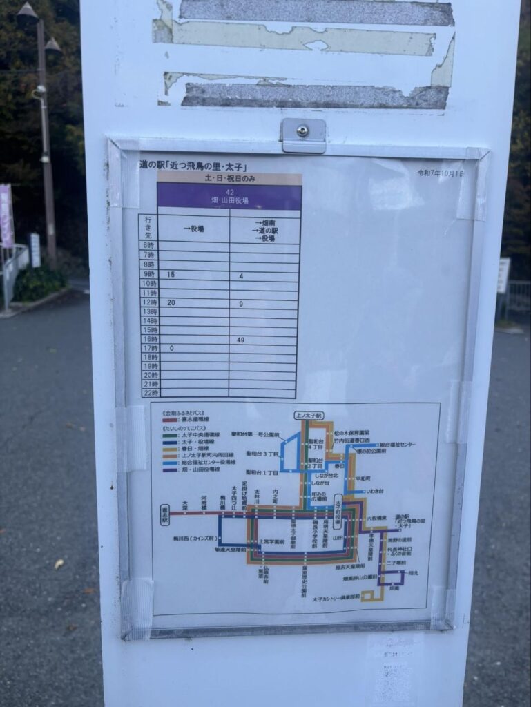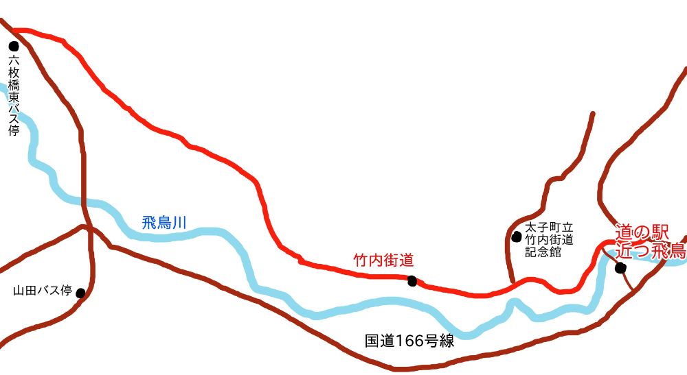公共交通の場合、休日は道の駅近つ飛鳥の里・太子までバスがありますが、平日は歩いていくしかありません。