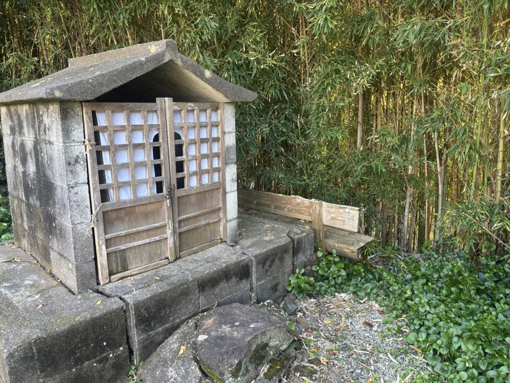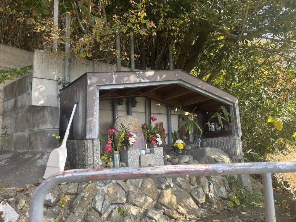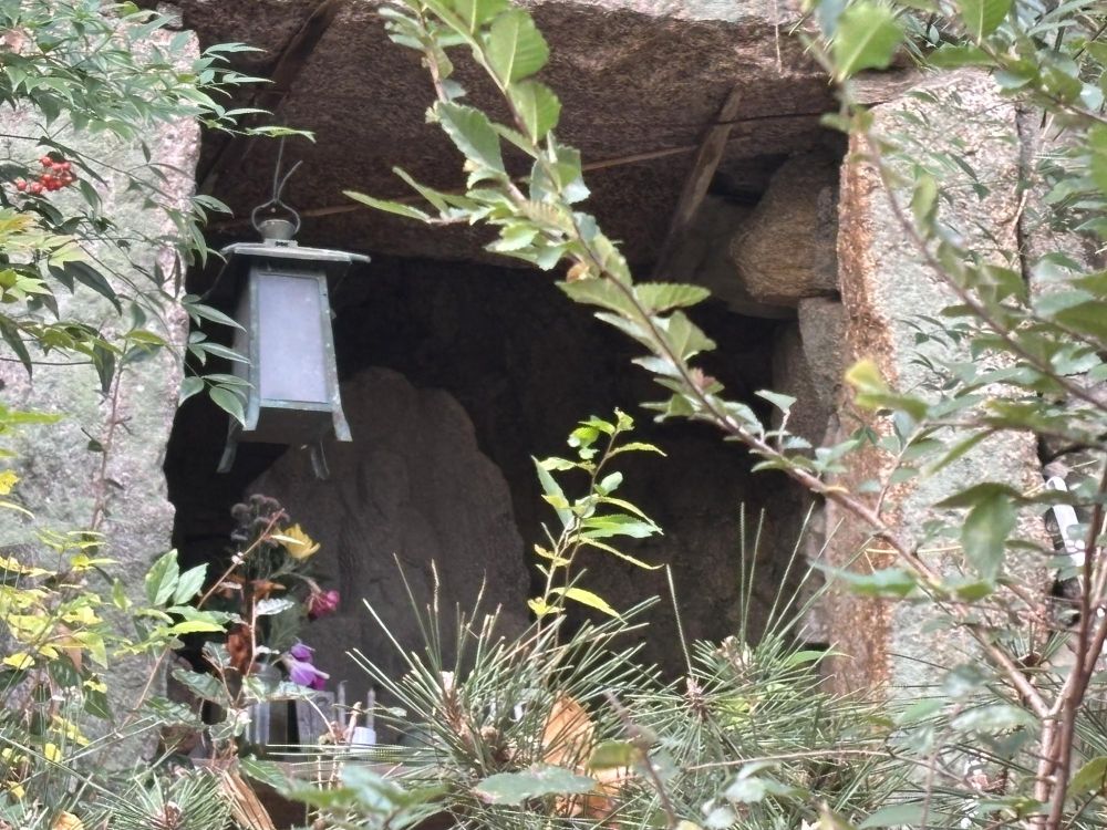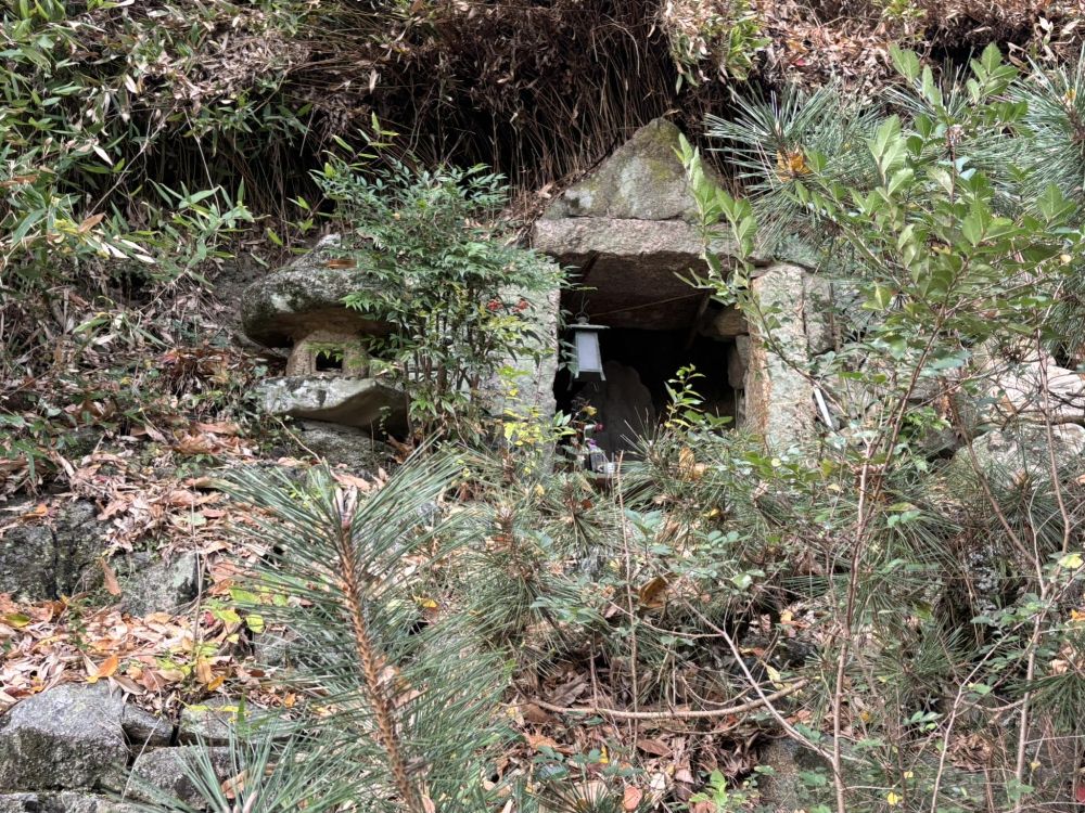 途中で見つけました。石灯籠と石を組み立てて作られた祠がみえます。