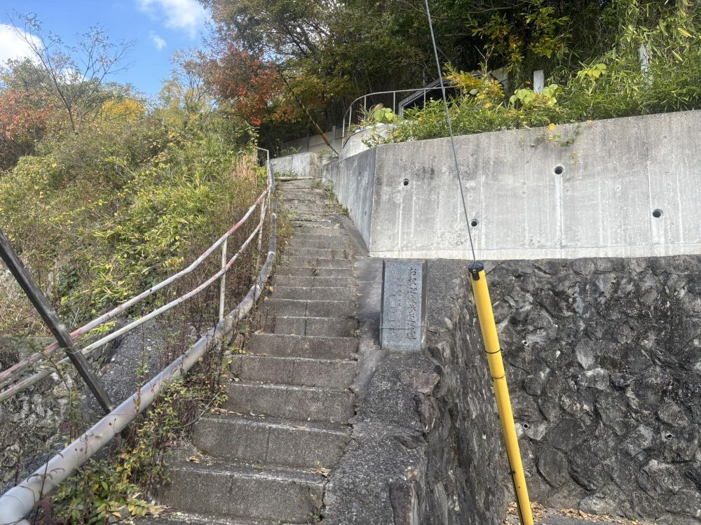 竹内街道は所々で横に細い路地があります。こちらの路地は階段になっていました。途中にお釈迦様参道修理の石碑があります。