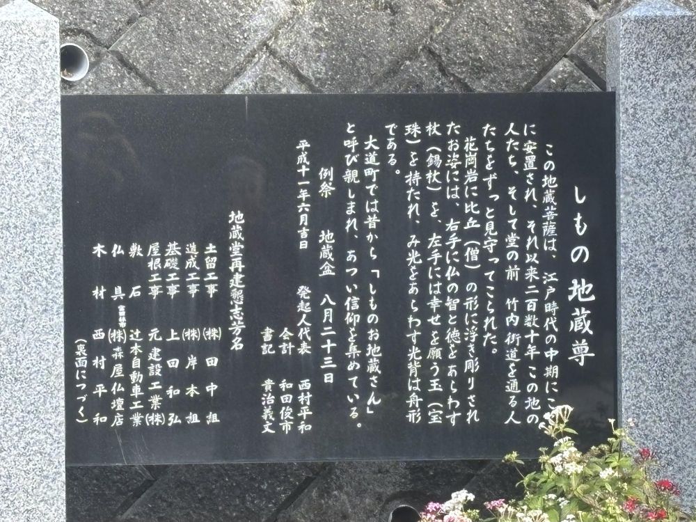 江戸中期に安置されたしもの地蔵尊の紹介です。竹内街道を通る人たちを二百数十年見てきた地蔵菩薩で、大道町では「しものお地蔵さん」と呼んでいたとのこと。