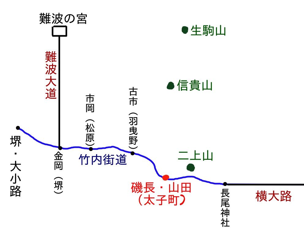 現在は堺市の大小路から奈良県葛城市の二上山の東麓・長尾神社に至る全長約30kmで、その先は横大路とよばれる道になっています。