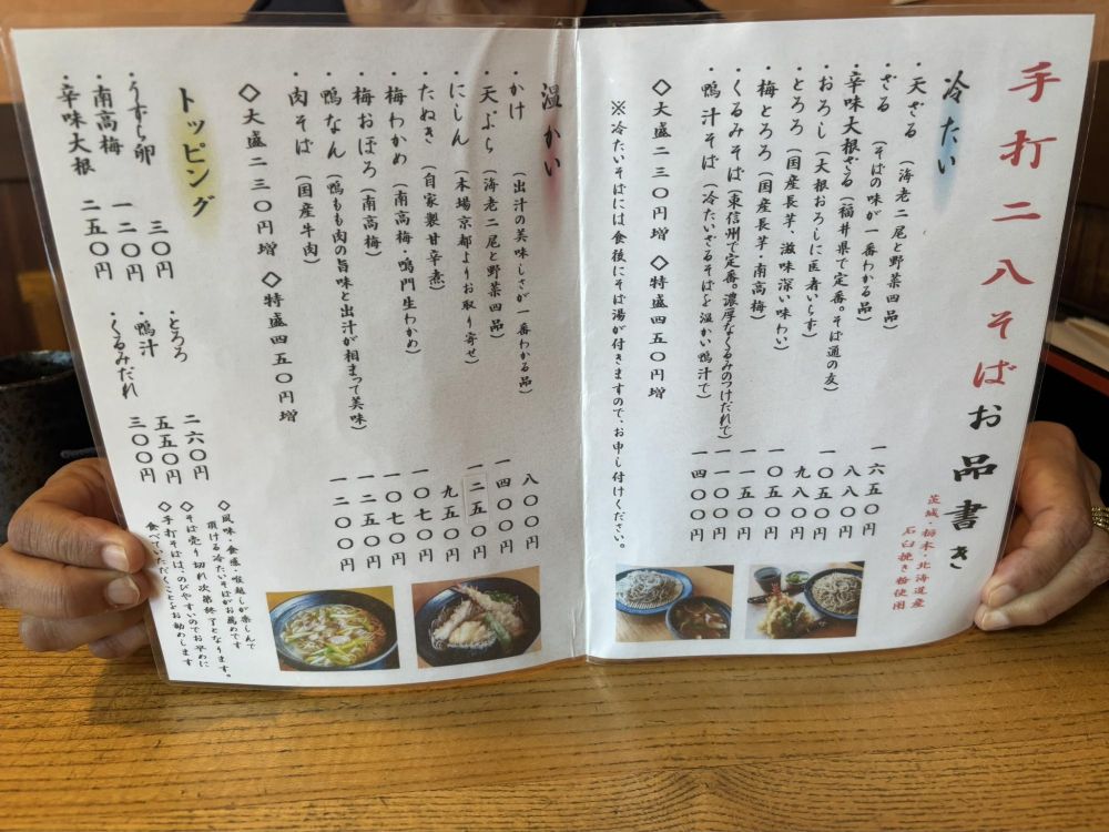 そして二八そば専用のお品書きです。冷たい方はざるや天ざるをはじめ、おろし、とろろ、くるみなど。温かい方はかけ、にしん、たぬき、鴨なんなど、こちらもいろいろあります。またそばは大盛りや特盛にもできます。