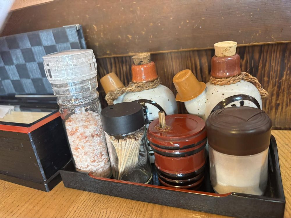 テーブルに備え付けられている調味料類です。左にあるのは岩塩です。後でこの岩塩が非常にそばの美味しさを引き立てる存在になることは、出来上がりを待っているこの時には全く気づきませんでした。