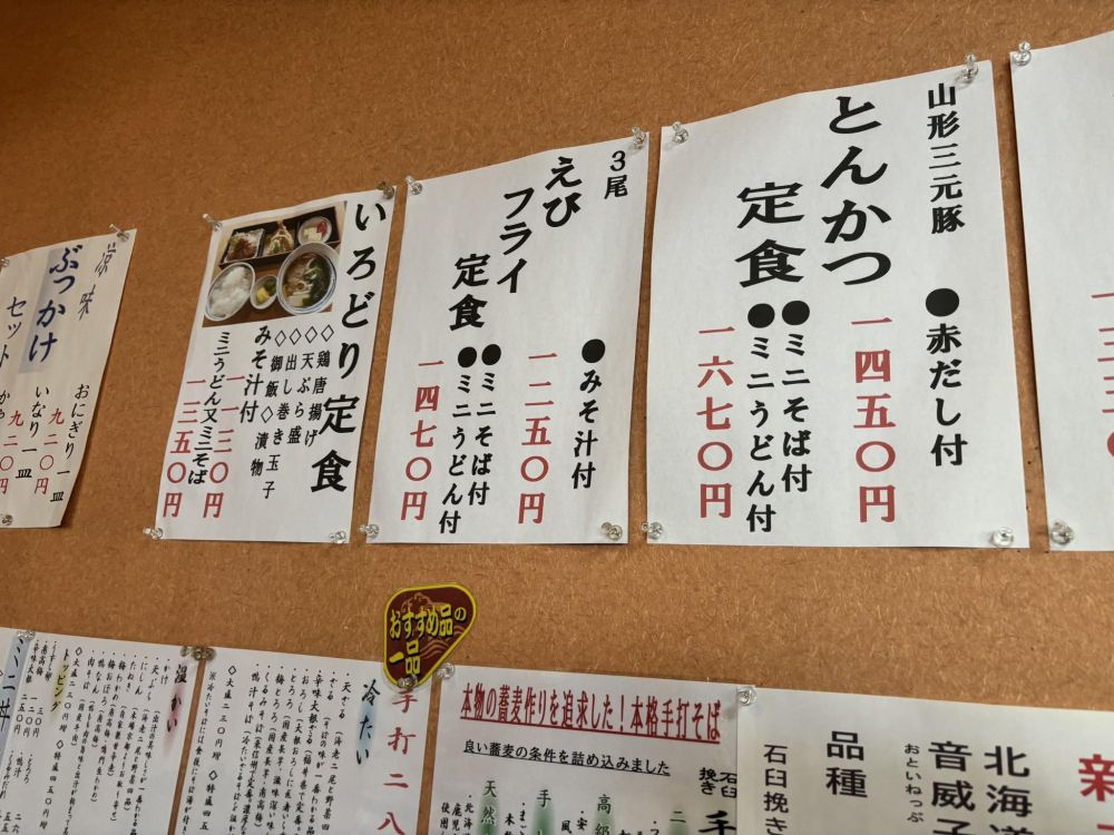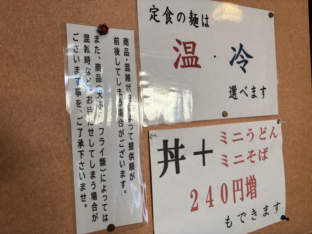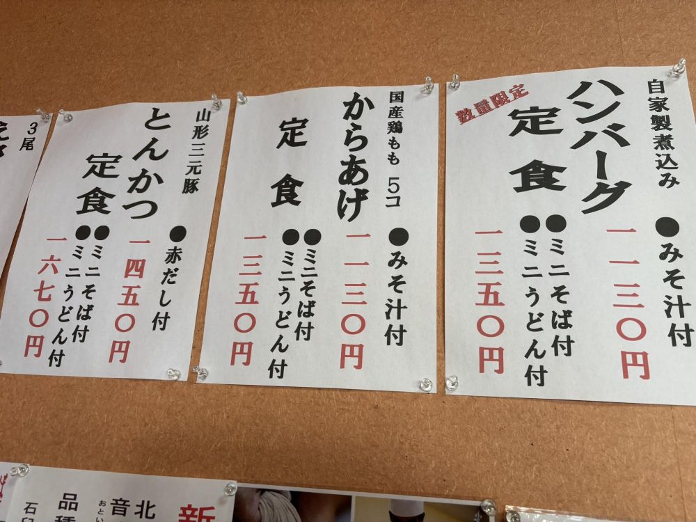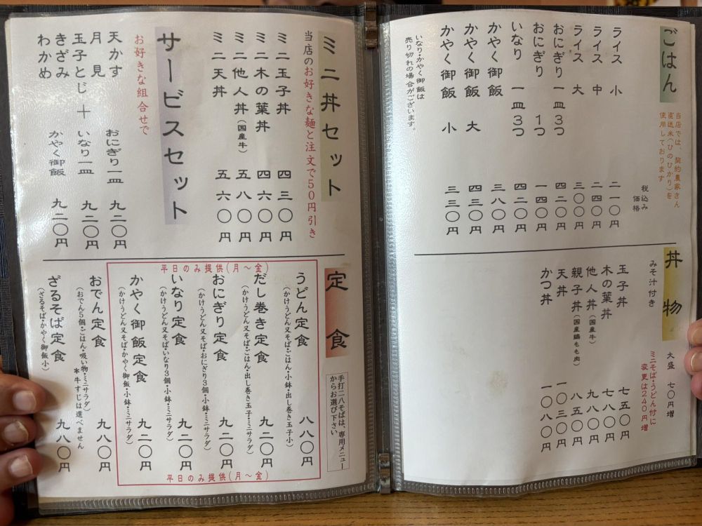 ごはんものや丼物、定食などがあり、そば屋さんだけど普通にお昼の定食屋さんとして利用できます。そして3桁料金が多く(それも税込表記!)、特に平日限定でお得な定食があります。リーズナブルにお昼が楽しめるというわけですね。